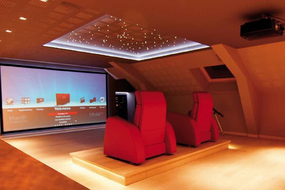Oui. Nous intervenons pour la création d’ambiances lumineuses adaptées aux salles de cinéma privées : circuits dédiés, éclairages de circulation, lumière tamisée ou indirecte… Le but est de concilier confort d’usage au quotidien et atmosphère propre à la projection, en intégrant la salle dans l’installation électrique globale de la maison.
